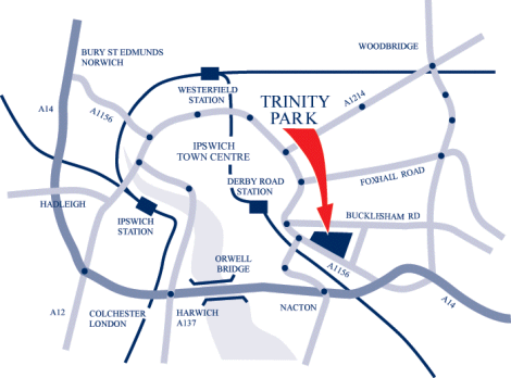Travel along the A12 until it joins the A14 and follow signs for Felixstowe, traveling over the Orwell Bridge. Follow directions from the A14 detailed above. From the North – Lowestoft & Great Yarmouth: Exit the A12 at the Seven Hills Roundabout, pass under the bridge (A14) and follow the A1156 towards Ipswich. Travel a little over a mile, passing a Honda Garage on your right, until you come to a roundabout. Take the third exit at the roundabout to enter Trinity Park.